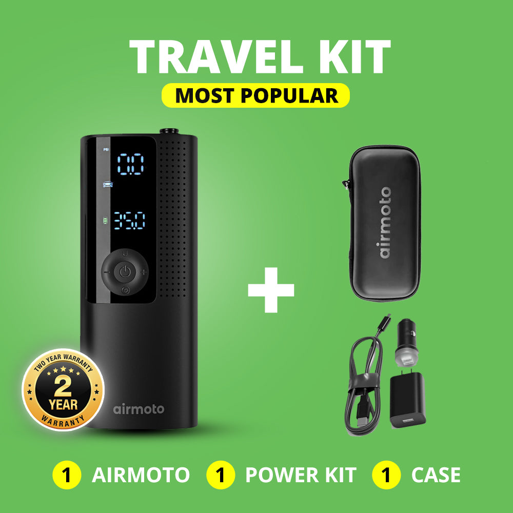 The Airmoto Travel Kit includes the (1) Airmoto Tire Inflator, (1) Power Kit, (1) Carrying Case, and an Extended 2-Year Warranty!